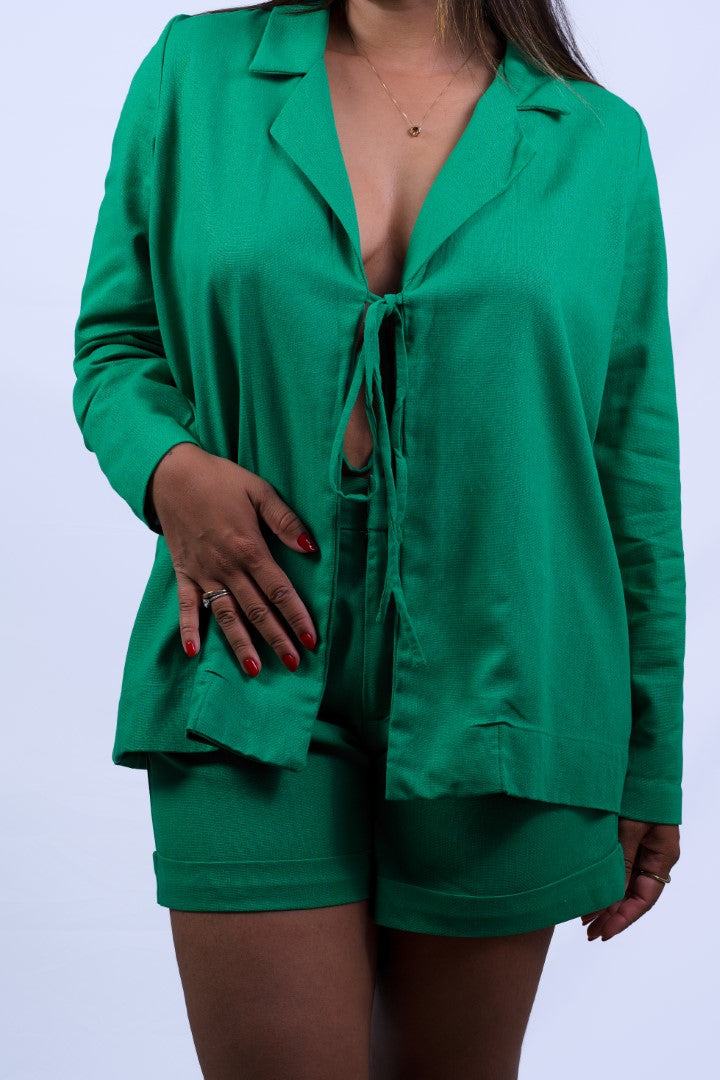 Featuring classic lapels and a delicate front bow detail, this blazer adds a feminine and sophisticated touch to any look. Its versatile design allows it to be worn as a layering piece or styled as a blouse-style top, making it suitable for both casual and refined occasions.